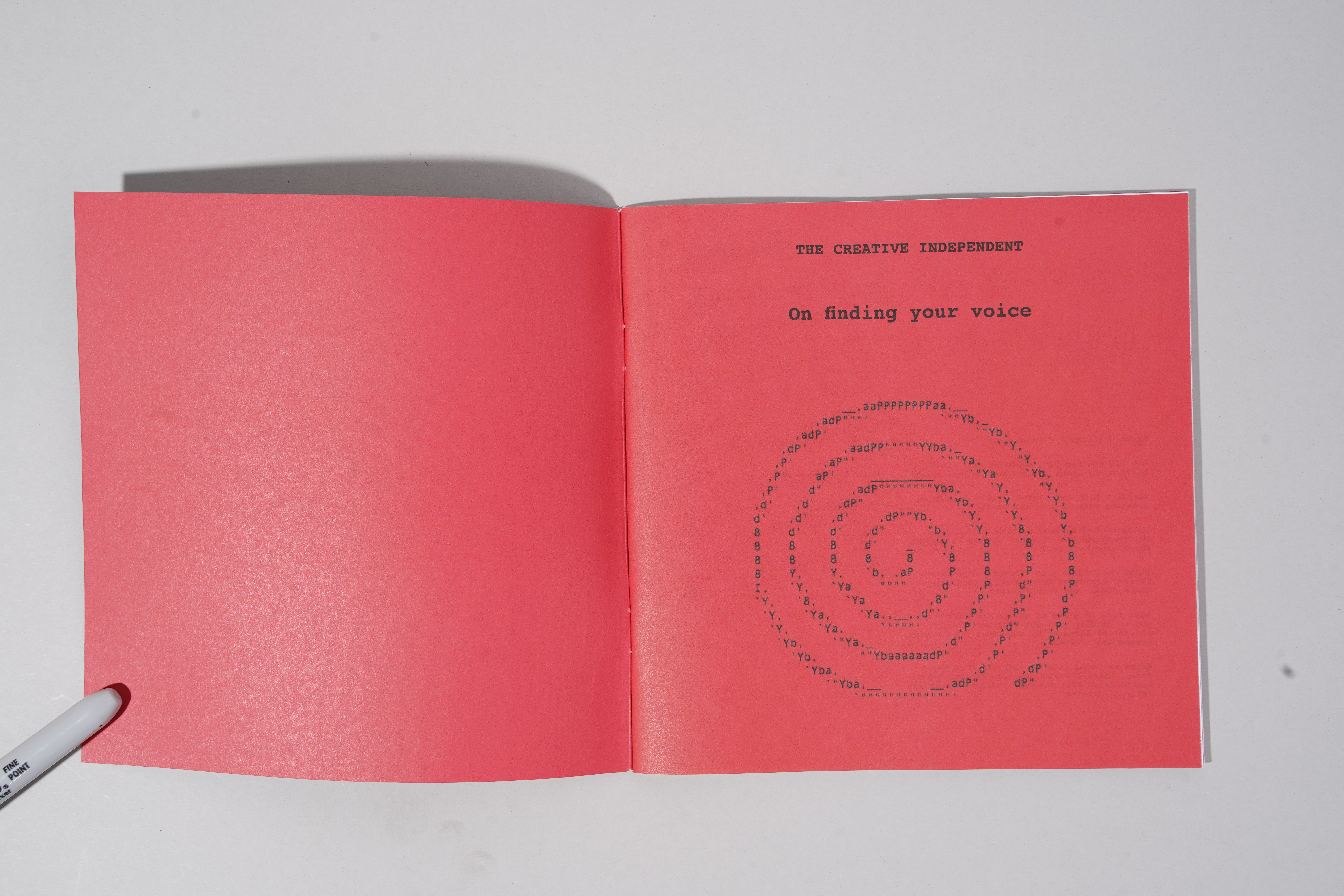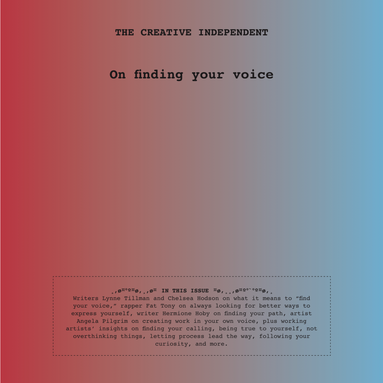 A zine published by The Creative Independent, compiling quotes, excerpts, and recommendations from working artists, all gathered from our archive. Topics covered include always looking for better ways to express yourself, finding your path, creating work in your own voice, following your curiosity, and more.